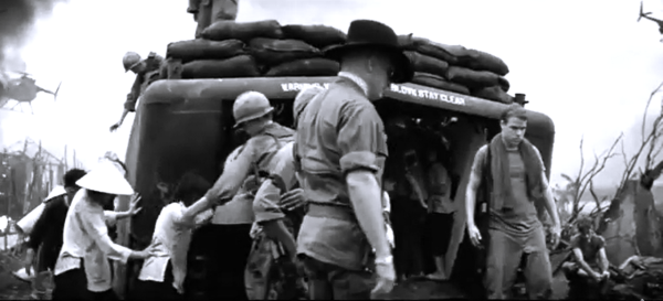 But to my immense financial good fortune, my Kiwi mate Chris found me in the crowd and said that the stunt coordinator wanted some drug addled, sex starved, and strikingly handsome grunts to hurdle barbed wire, storm the pontoon with the gyrating bunnies, do battle with the M.P.s, knock out the Green Beret escort, grab the girls, and once this is done, head for the Huey. That sounded way better than being an M.P.